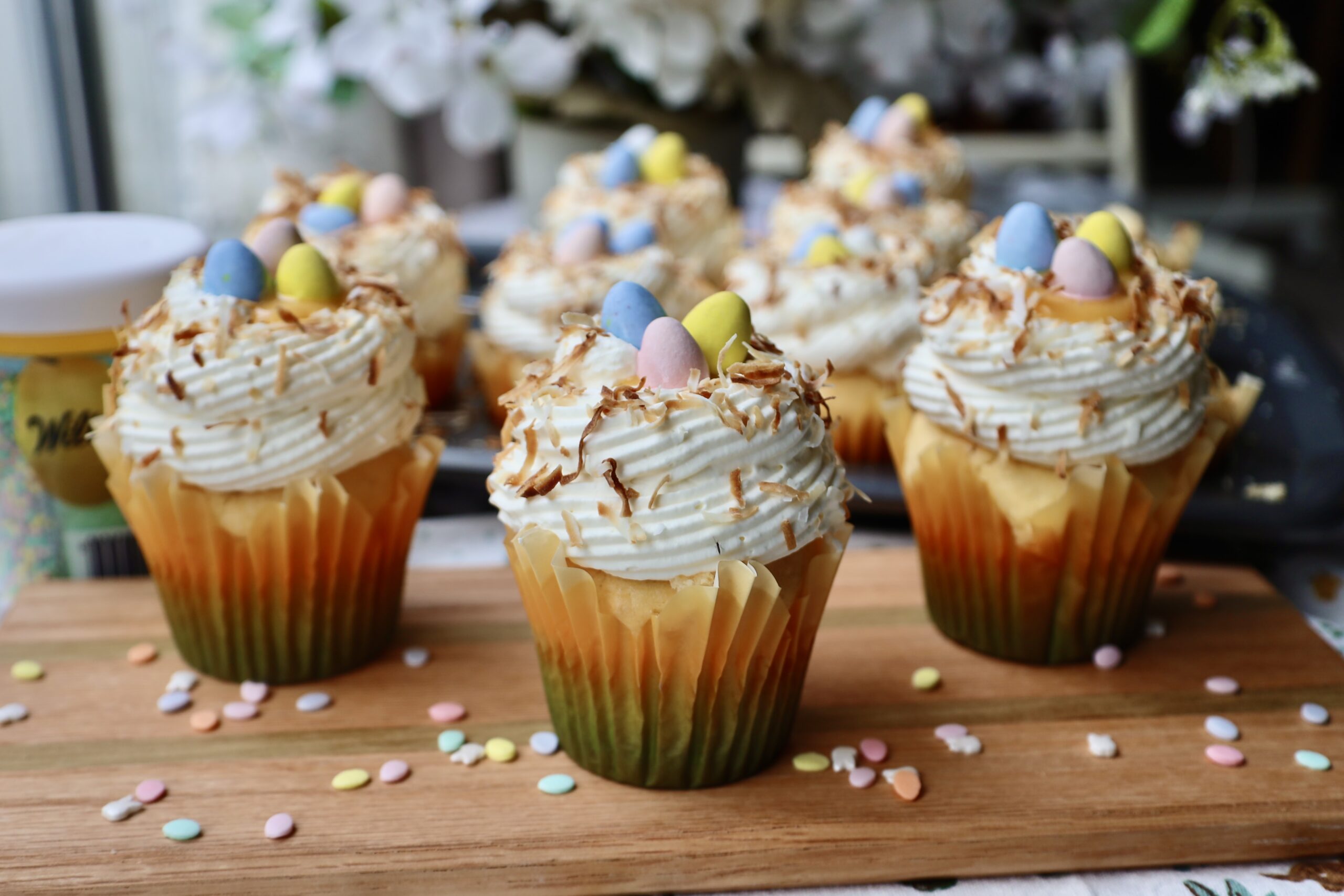 - Using the bottom of a piping tip, scoop out a little piece from the center of each cupcake so you can fill the curd in. You can place the curd in a squeeze bottle for easier filling. Cover it back up and then pipe the frosting on each filled cupcake leaving the center a little open to fill more curd inside. Sprinkle with toasted coconut flakes and 3 Cadbury eggs on top. Enjoy!